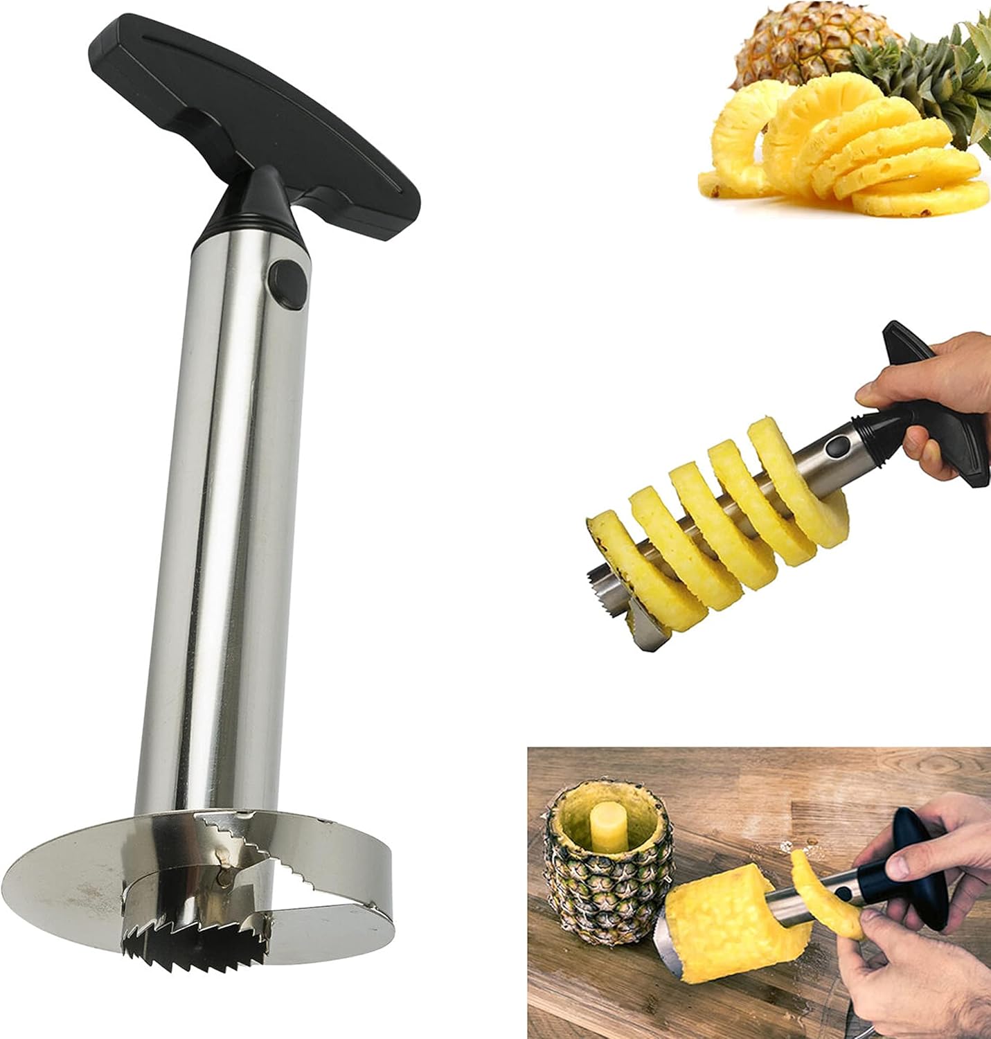 The pineapple cutter, slicer, and corer are equipped with a removable handle for effortless cleaning and can peel, core, and slice a whole pineapple within seconds.